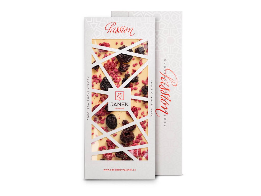 Passion - to sú čokolády, ktoré majú viac percent a tiež viac chutí. Hrali sme sa, kombinovali sme. Všetky ingrediencie spolu ladia a maximálne zvýrazňujú chuť bielej čokolády. Mrazom sušené černice, maliny, čerešne a lupene ruží. Aj keď sme ju tvorili v zápale a s vášňou, vznikla z toho tabuľka harmónie.