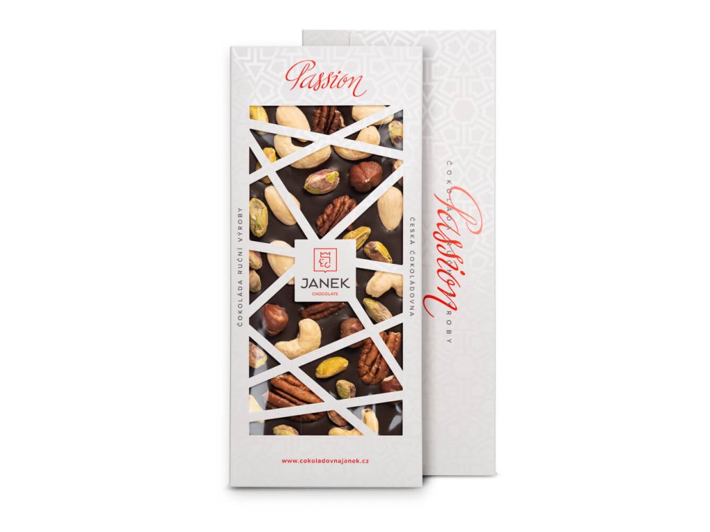Passion - to sú čokolády, ktoré majú viac percent a tiež viac chutí. Hrali sme sa, kombinovali sme. Všetky ingrediencie spolu ladia a maximálne zvýrazňujú chuť pravej horkej čokolády. A v tomto prípade je to hrsť tých najlepších orechov. A keďže sme ju vytvárali s vášňou a zanietením, vznikla z toho tabuľka plná harmónie.