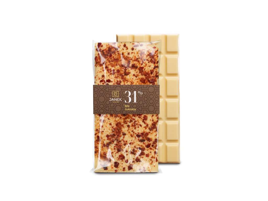 Sladká biela čokoláda s vôňou vanilky. Bez aróm a esencií. Ale zrnká pravej vanilky. Pridajte štipku nasekaného chilli a máte tabuľku, ktorá vonia, chrumká a zároveň zahreje vaše chuťové poháriky.