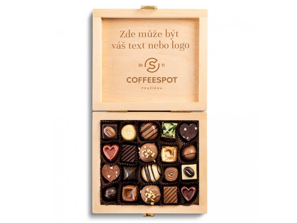 Drevená darčeková krabička s pralinkami a hľuzovkami 20 ks + možnosť personalizácie
