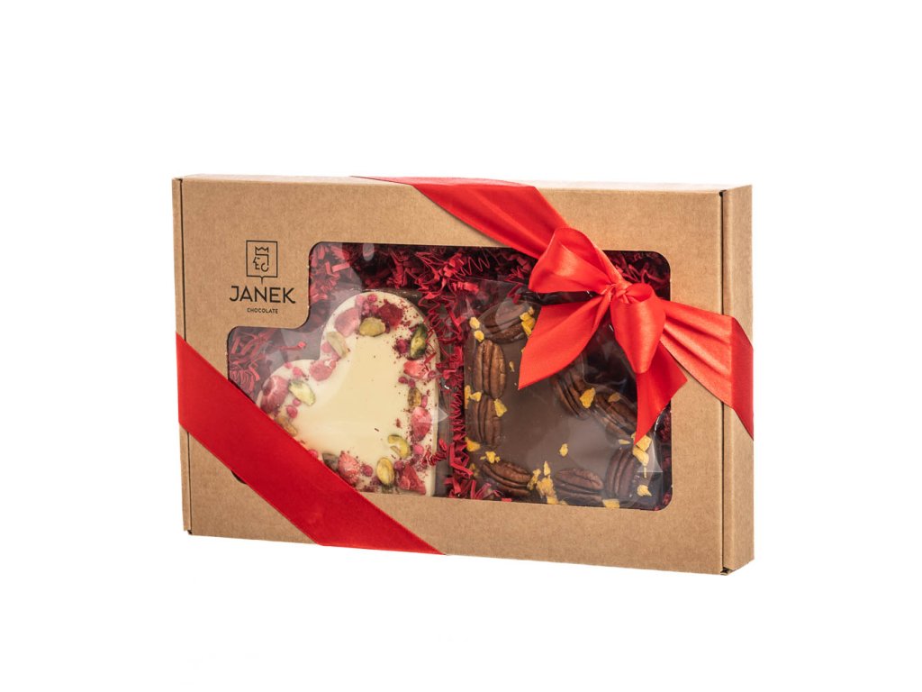 Zdieľajte svoje srdce so svojou spriaznenou dušou. V škatuľke nájdete mliečne srdce s pekanovými orechmi a lyofilizovaným pomarančom a biele srdce s lyofilizovanými jahodami, malinami, černicami, pistáciami a ružou.