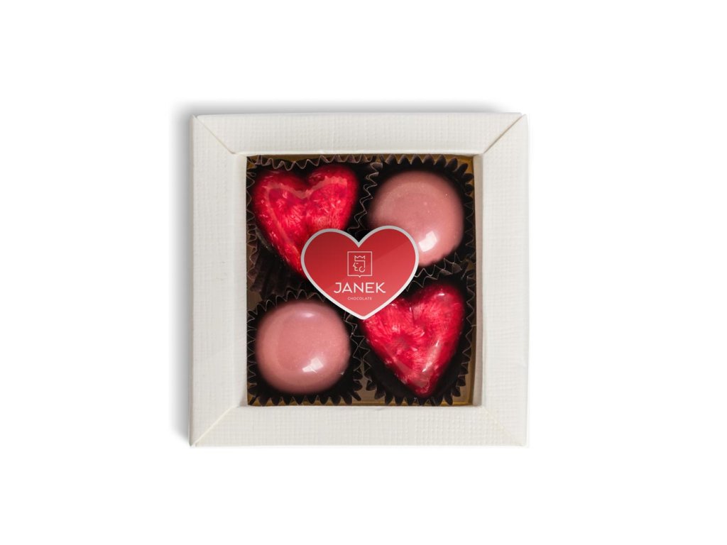 Krabička obsahuje 4 pralinky. Srdiečka s obľúbenými lieskovými orieškami a ríbezľovými pralinkami z limitovanej edície v ruby čokoláde.