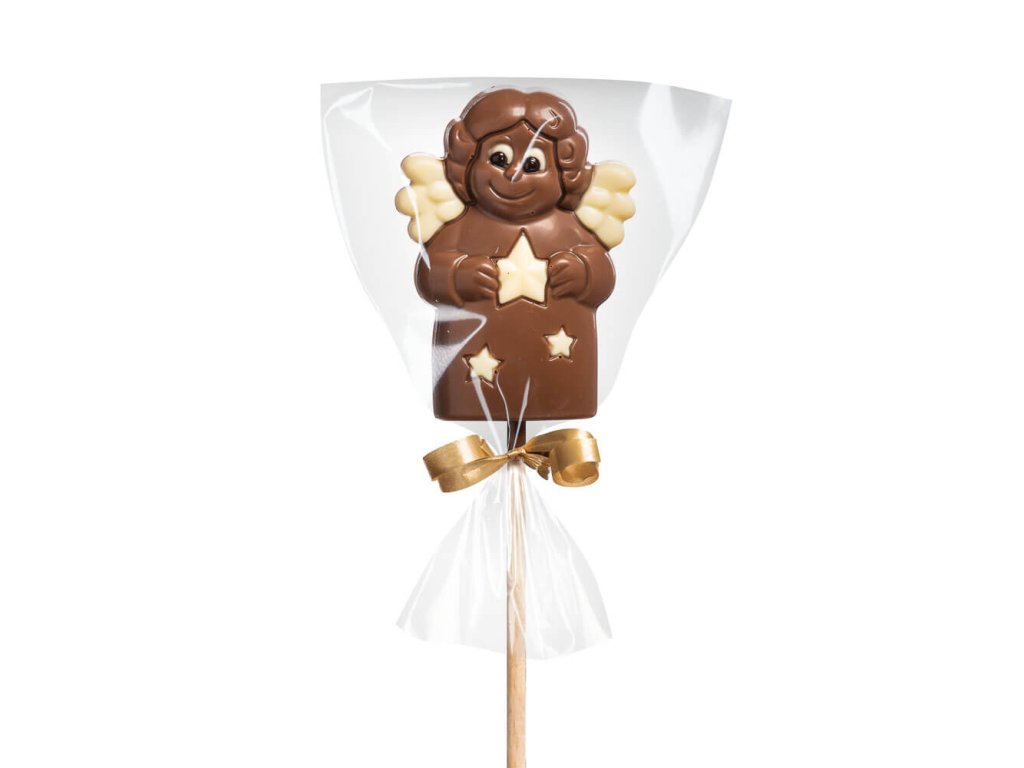 Čokoládová lízanka v tvare anjelika je našou odpoveďou na to, ako si nezašpiniť ruky od čokolády. Kvalitná čokoláda s vôňou vanilky. Bez príchutí a esencií. Zato pravé vanilkové zrnká. Vonia, chrumká a pomaly sa rozplýva na jazyku.