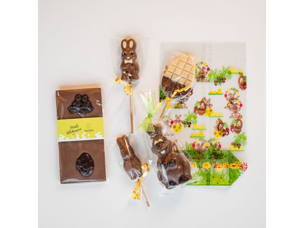 Čokoládová figúrka (12 cm) zajačika, 3x lízanky s mliečnou, bielou a horkou čokoládou, tabuľka mliečnej čokolády s figúrkami.