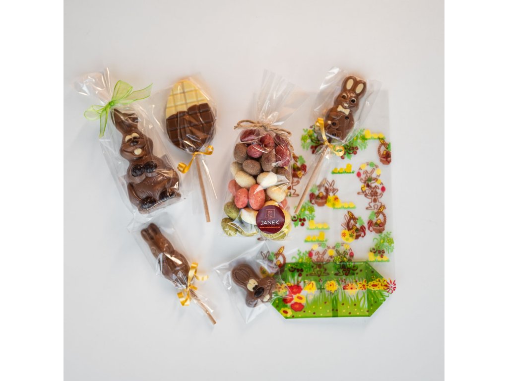 Čokoládová figúrka (12 cm) zajačika, veľkonočné vajíčka (mandle v čokoláde), 3x lízanky s mliečnou, bielou a tmavou čokoládou, zajačik.