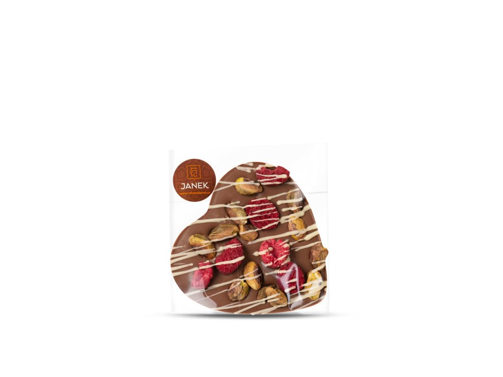 Veľké srdce z mliečnej čokolády s malinami, pistáciami a bielou čokoládou