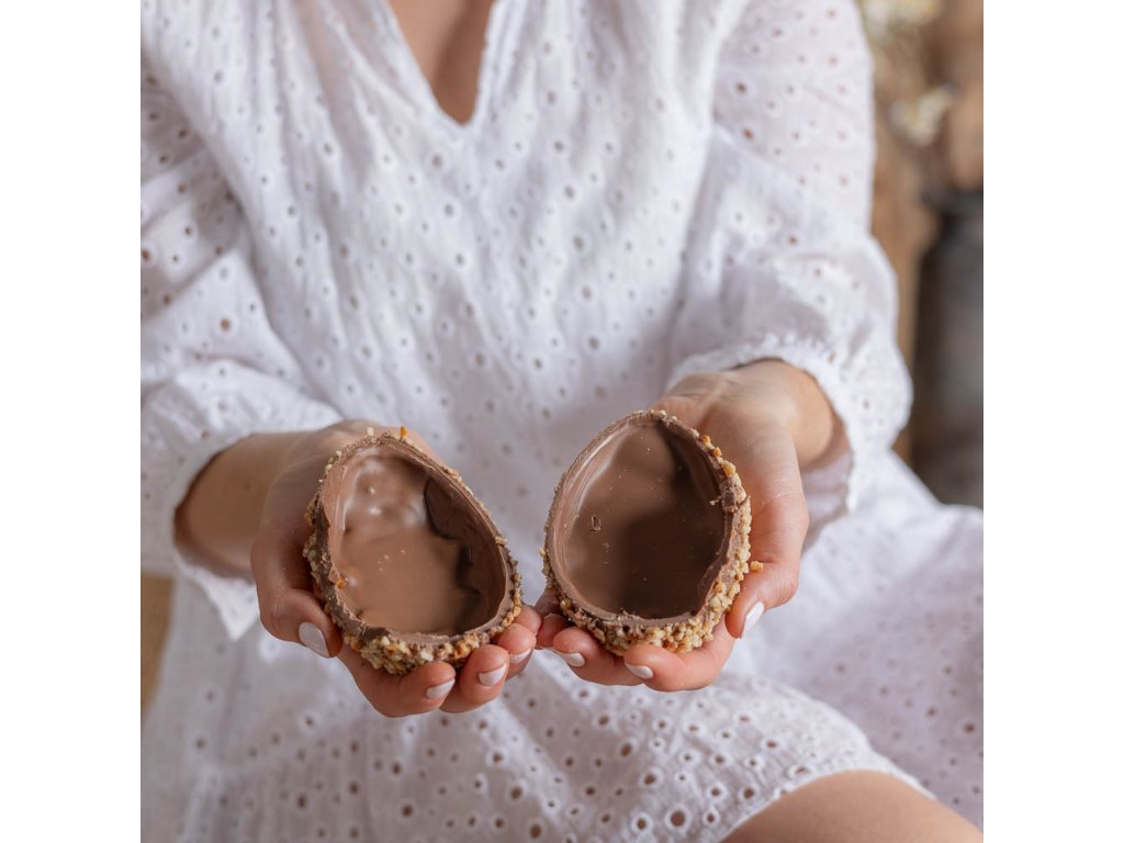 Veľké mliečne vajce plnené nugátom a obalené v lieskových orieškoch