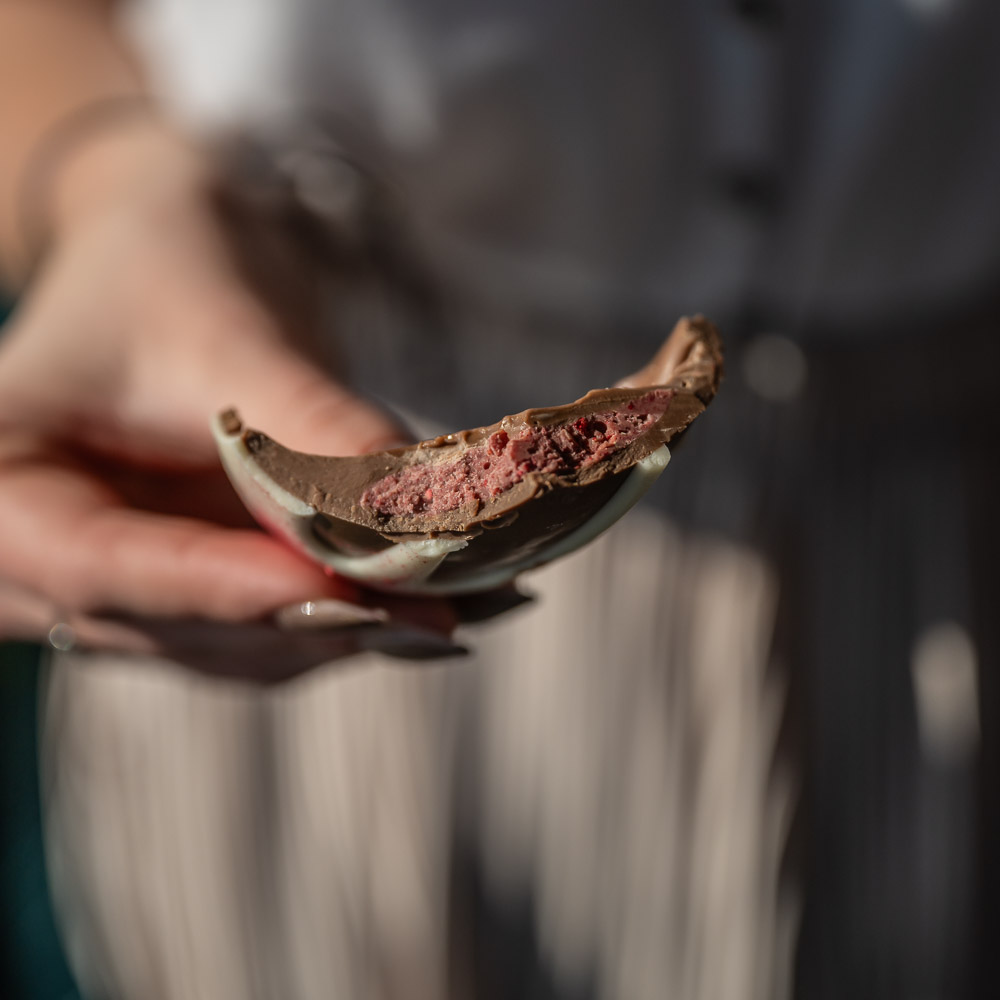 Vrchnú časť vajca sme poliali bielou čokoládou a dozdobili lyofilizovanými malinami. Práve tie dodávajú finálnu bodku v podobe jemne kyslastého tónu, ktorý krásne vyvažuje sladkosť čokolády. Výsledkom je dokonale harmonická kombinácia chutí – sladká, krémová, svieža a neodolateľná. Jednoducho vajce, ktoré vás bude baviť od prvého zahryznutia až po poslednú omrvinku.
