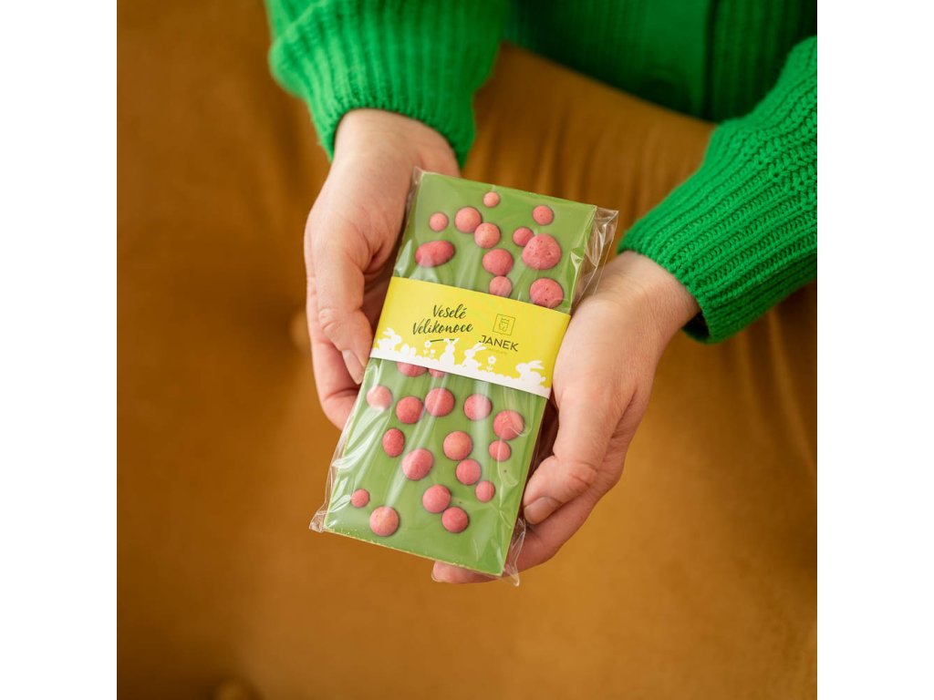 Vajíčka v tráve? To je naša veľkonočná čokoláda. Biela čokoláda s prírodným zeleným farbivom a malinami obalenými v bielej čokoláde. Bez príchutí a esencií. Zato pravé vanilkové zrnká.